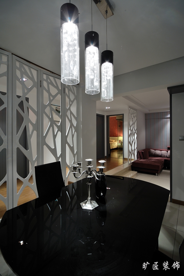 以现代简约风格呈现,由于本户型是错层结构,客厅与餐厅形成了开放式的呈现,为了区分空间,设计师把餐厅区域地面作抬高处理。而房间与客厅餐厅是两个水平面,故中间形成一个过道,为了使过道光线充裕,采用木格雕花作隔断,让光线能自由穿梭整个空间。在色彩方面设计以黑与白为基调,客厅用沉稳大气加上直线式和漫射式的光影互相对照,餐厅黑色桌椅与黑色备餐柜相呼应,地面采用的是浅色地砖,它们将整个空间装点得更加立体、生动。灯光由上而下跳跃在整个空间,以吸引人的注意,这正是光的使者演绎着一段又一段的精彩。