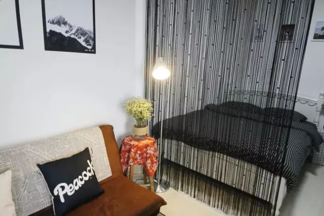 加上女朋友觉得床和沙发要隔开,私人空间要一种安全感。于是果断考虑了下面这种水晶珠线帘用来隔开动静两个区域。价格和观赏性都很好,黑色比较耐看。安装需要打孔,相对简单。