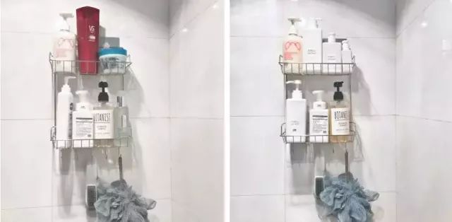 有个关键的点就是为了让置物架上的洗浴用品看着舒服,就要把这些用品的颜色统一。于是在网上买了慕斯起泡瓶,把洗发水沐浴露什么的全部分装在这个白色瓶子里。视觉上就很舒服了。